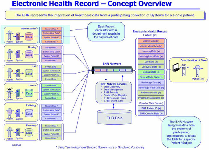 One of the key features of an EHR is that it can be created, managed, and consulted by authorized providers and staff across more than one health care organization. A single EHR can bring together information from current and past doctors, emergency facilities, school and workplace clinics, pharmacies, laboratories, and medical imaging facilities